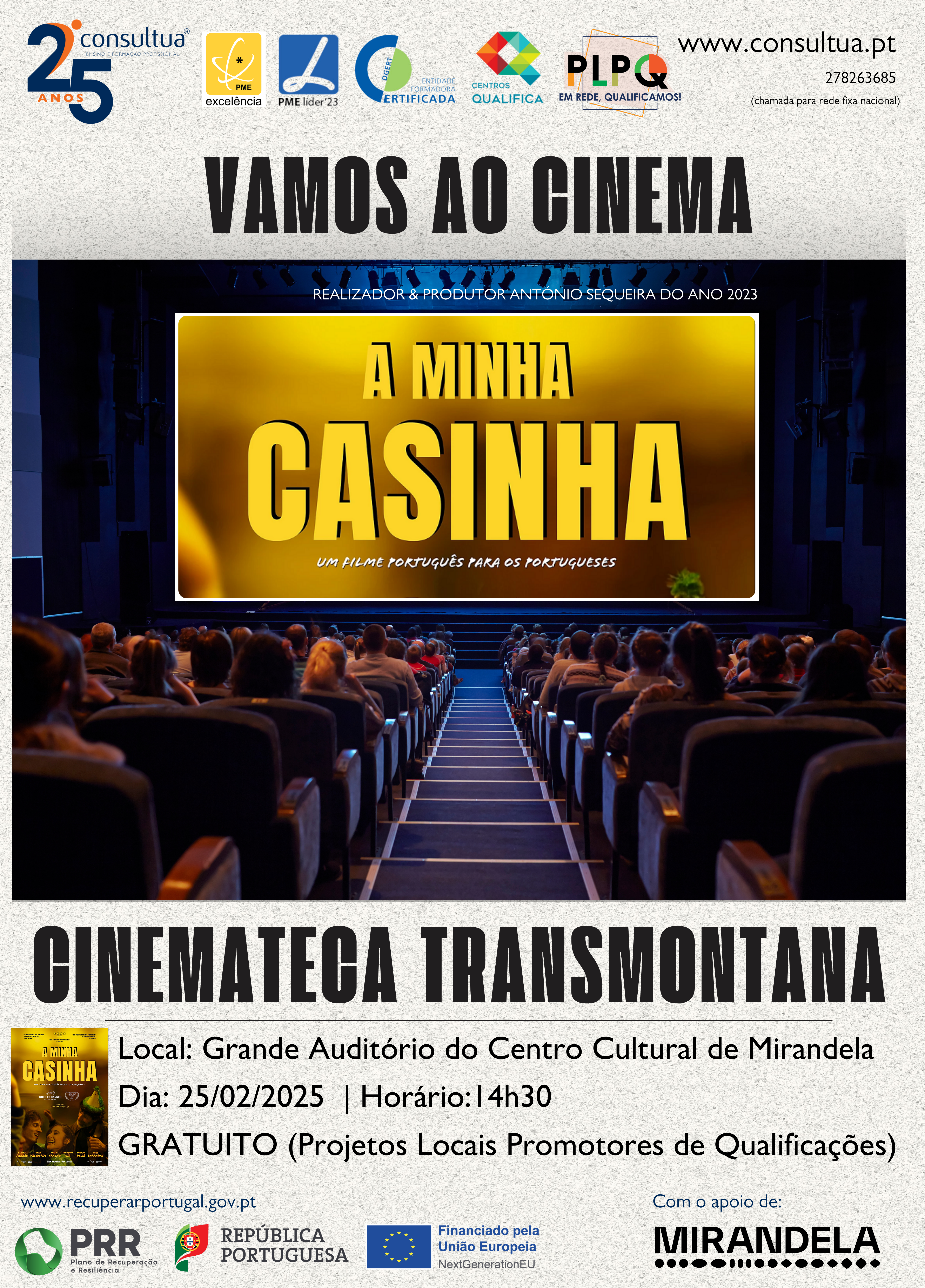 No dia 25 de fevereiro de 2025, o Centro Qualifica da Consultua de Mirandela proporcionou uma tarde agradável com uma sessão cinematográfica no Auditório Municipal de Mirandela. Este evento foi organizado no âmbito do projeto PLPQ, que visa apoiar o aumento das qualificações escolares de adultos. A atividade teve início